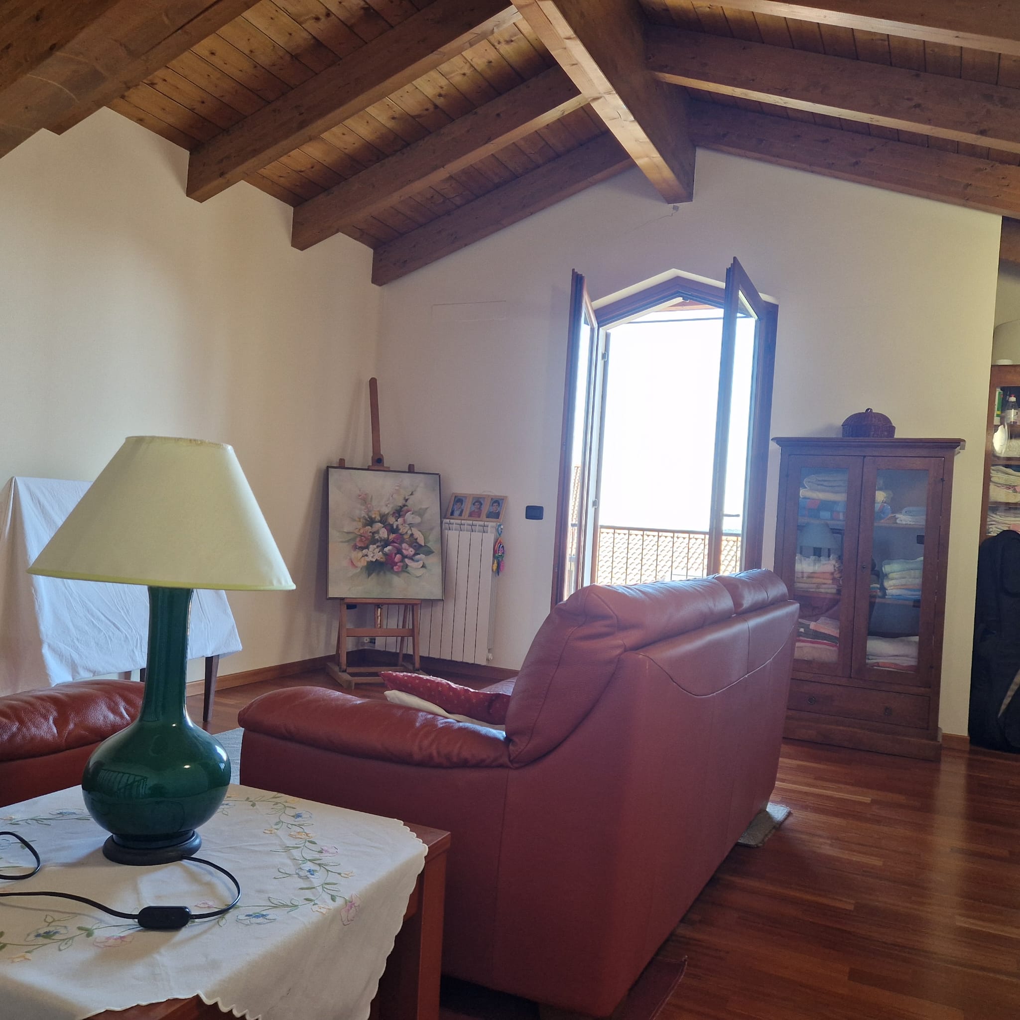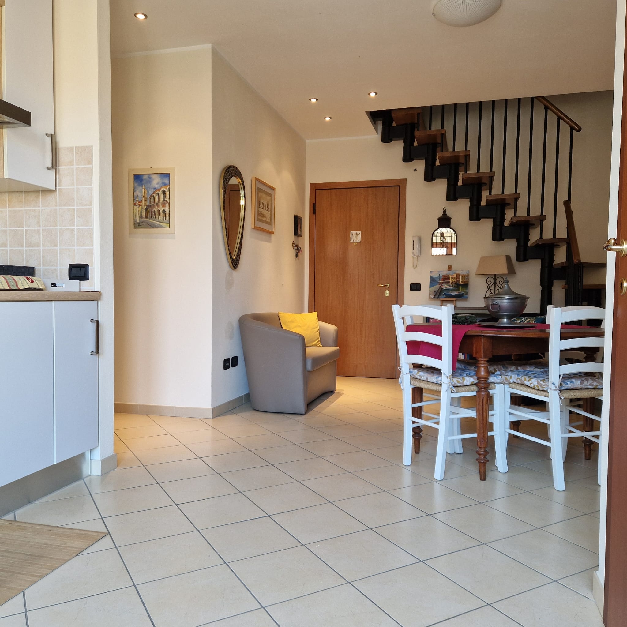 CAVAION VERONESE: in zona centrale comoda ai servizi, proponiamo in vendita elegante appartamento in recente contesto residenziale. L'immobile sito al primo piano, in posizione angolare, è disposto su due livelli. Entrando ci accoglie una luminosa zona giorno con angolo cottura e balcone coperto; nella zona notte abbiamo la camera matrimoniale con balcone, cameretta ed ampio bagno finestrato con doccia. Salendo al piano superiore, nella parte mansardata con un'altezza di oltre tre metri, si accede ad un locale attualmente destinato a salotto con un soleggiato balcone coperto, ad un'ulteriore zona hobby che può essere adibita a terza camera e ad un bagno lavanderia . Nell'interrato completa l'immobile un comodo garage singolo. Zona residenziale tranquilla ed elegante. C.E. "D"